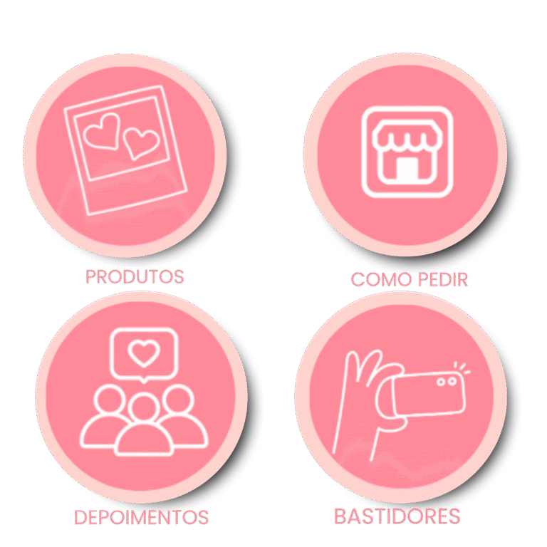 Você recebe destaques prontos para organizar seu perfil e facilitar a vida do seu cliente — com ícones para Produtos, Como Pedir, Depoimentos e Bastidores.